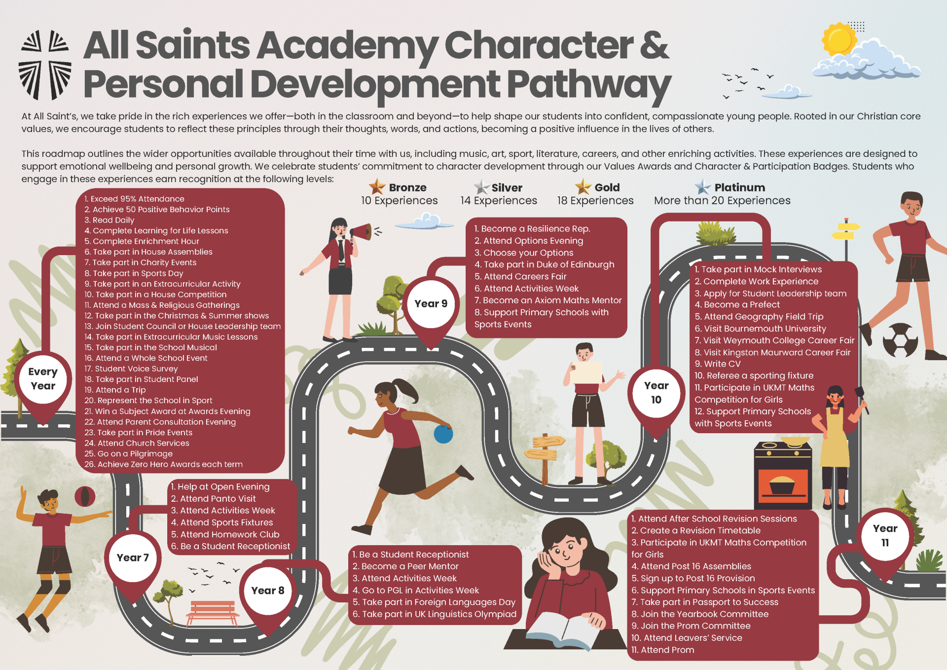 We are proud of the rich experiences we provide both in the classroom and across our wider curriculum offer. Our Character Development Pathway sets out the range of opportunities students will encounter during their time with us, including dedicated personal development time through Enrichment on a Friday morning, music, art, sport, literature, careers education, leadership, and volunteering. These experiences inspire students to embrace new challenges, discover their strengths, and grow personally and spiritually.